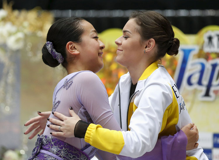 アデリナ(ソチ五輪女子シングル金メダリスト)が演技後、真っ先にハグしています。