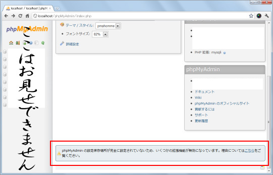phpMyAdminの設定保存場所が完全に設定されていないため、いくつかの拡張機能が無効になっています。理由についてはこちらをご覧ください。